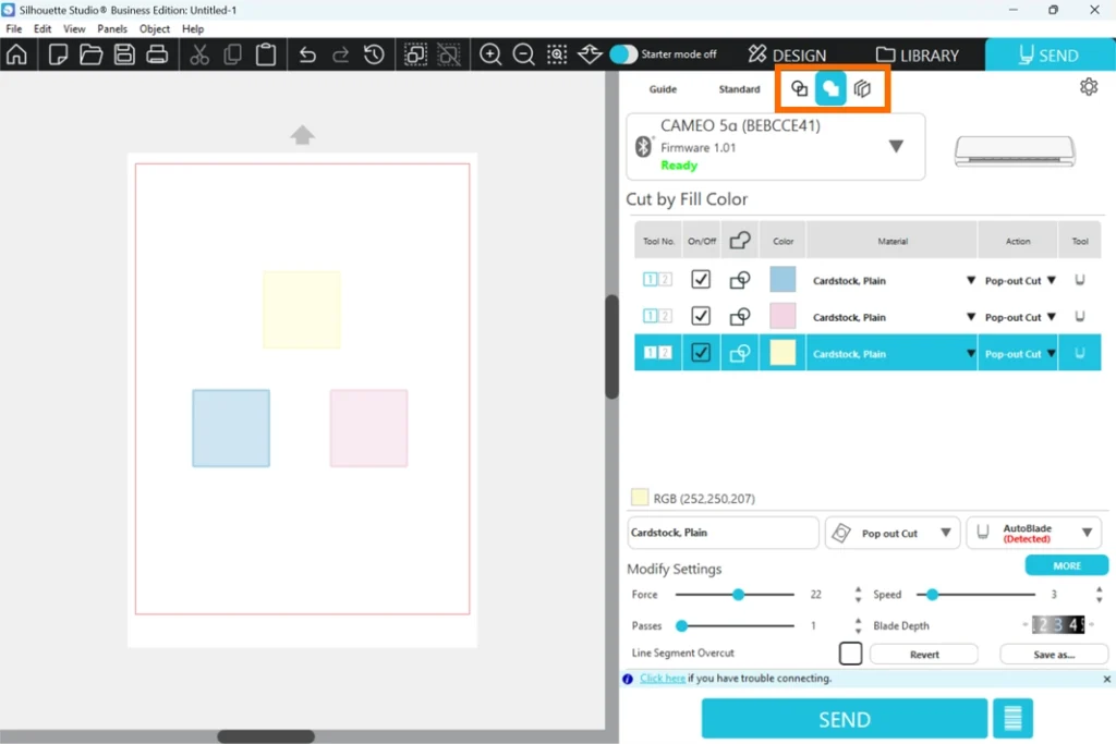 Silhouette Studioでは、[ 線の色 ]、[ 塗りつぶしの色 ]、[ レイヤー ] ごとにそれぞれ異なるカット条件を設定することができます。