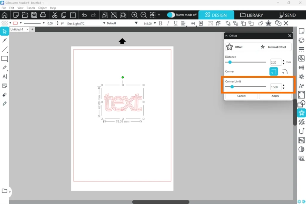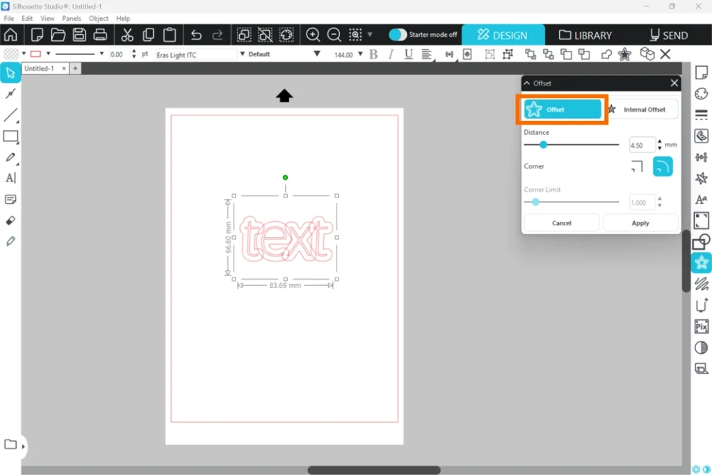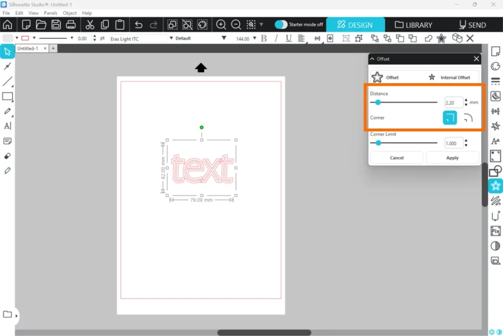4. Distance(距離) の数値でテキストの太さを調整し、Cornerで角の形状を指定します。