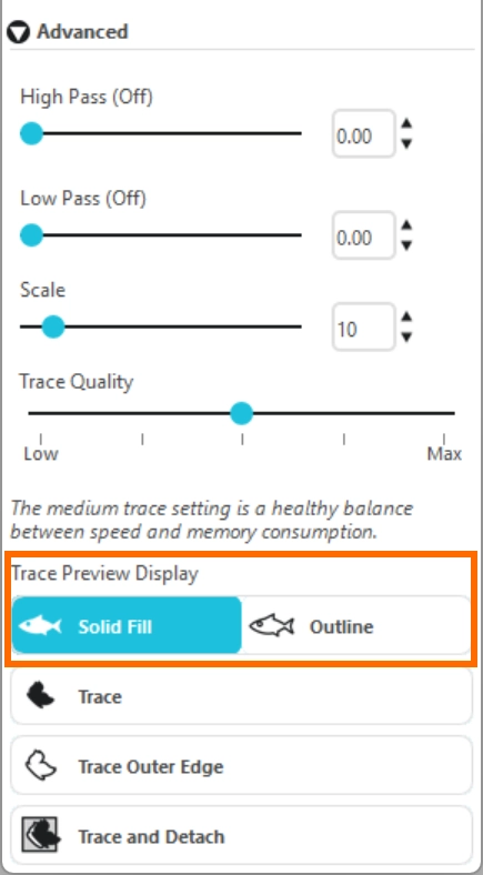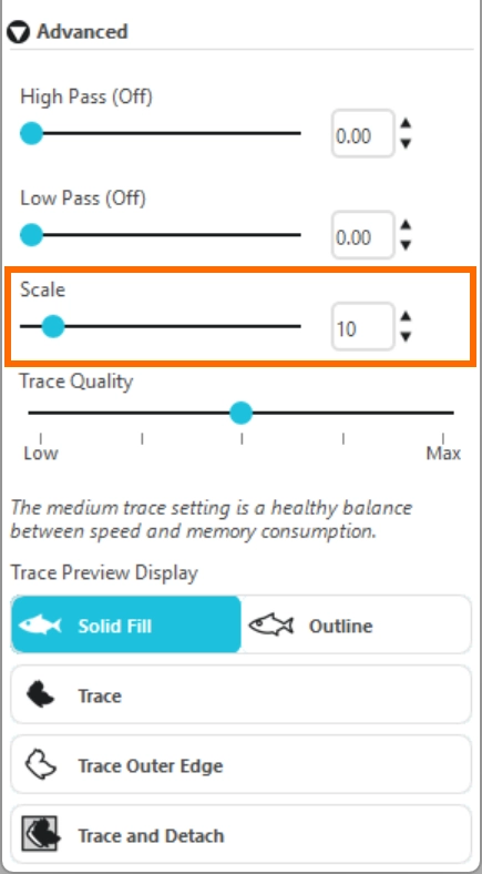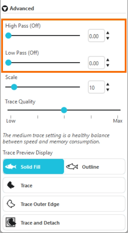 ハイパスフィルターは画像のエッジの詳細を検出し、外側から内側に向かってトレース部分の抽出をおこないます。プレビューを見ながら調整することで、画像の輪郭をくっきりさせることができます。