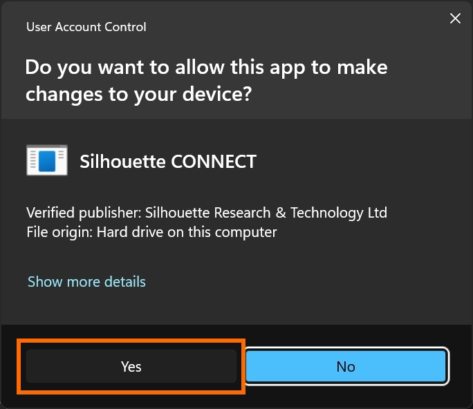 5. ユーザーアカウント制御の画面が表示されたら、プログラム名が ” Silhouette Connect “であることを確認し、[ はい ]をクリックして下さい。