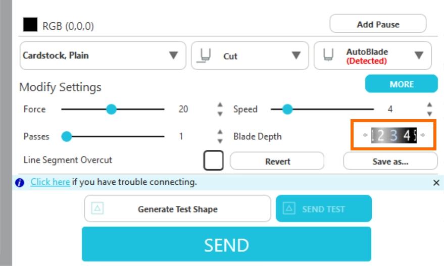 カット圧を最大値に設定してもカットできない場合は、刃出し量を1つ上げて再度テストカットを行います。
