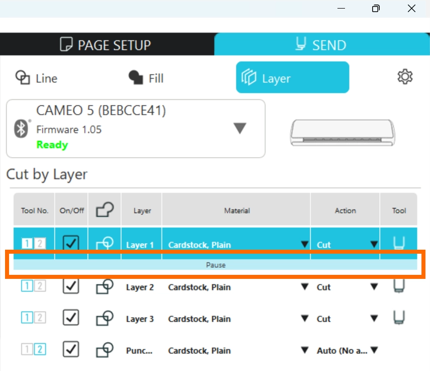 [ 線の色 ]、[ 塗りつぶしの色 ]、[ レイヤー ]ごとに分けられたカットの途中で、一時停止するように設定することができます。