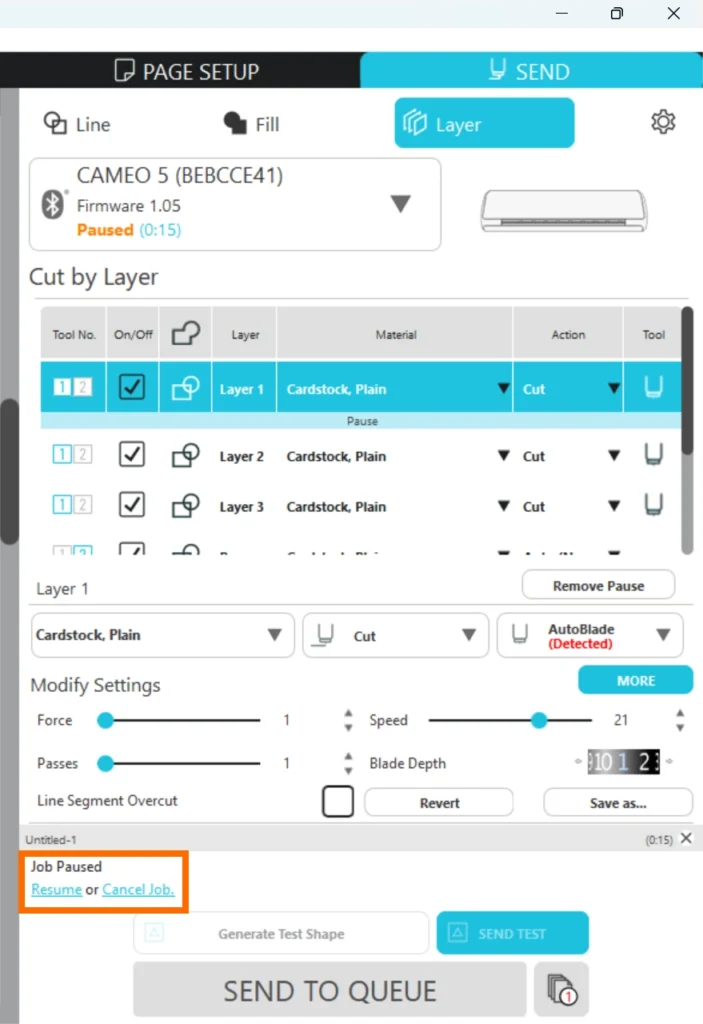 5. 送信ボタンをクリックして、カットデータをマシンに送信します。