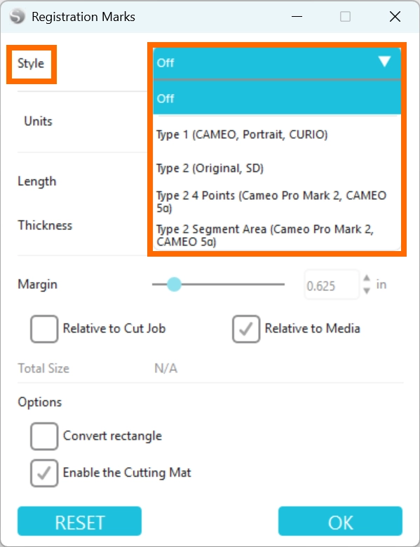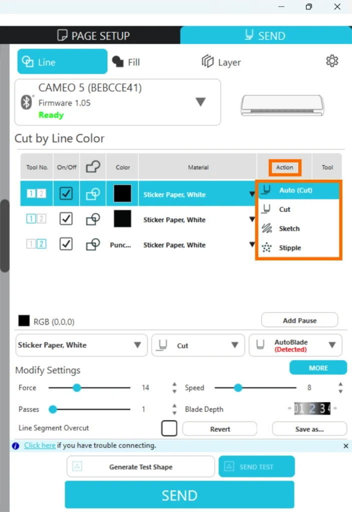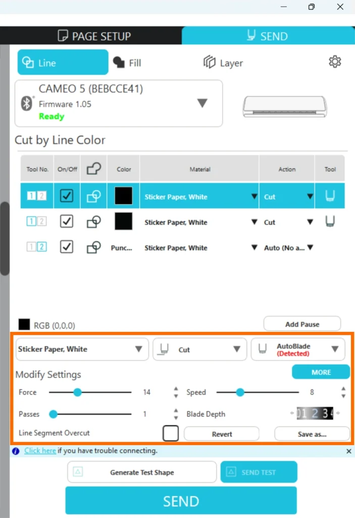 カット条件があらかじめ設定されているのは、Silhouetteの純正メディアのみとなります。その他のメディアを使用する場合は、テストカットを行って適切なカット条件を確認してください。