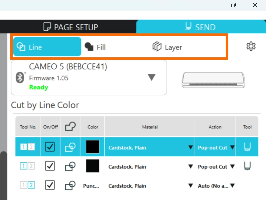 線の色や塗りつぶしの色、レイヤーごとに異なるカット条件を設定することができます。