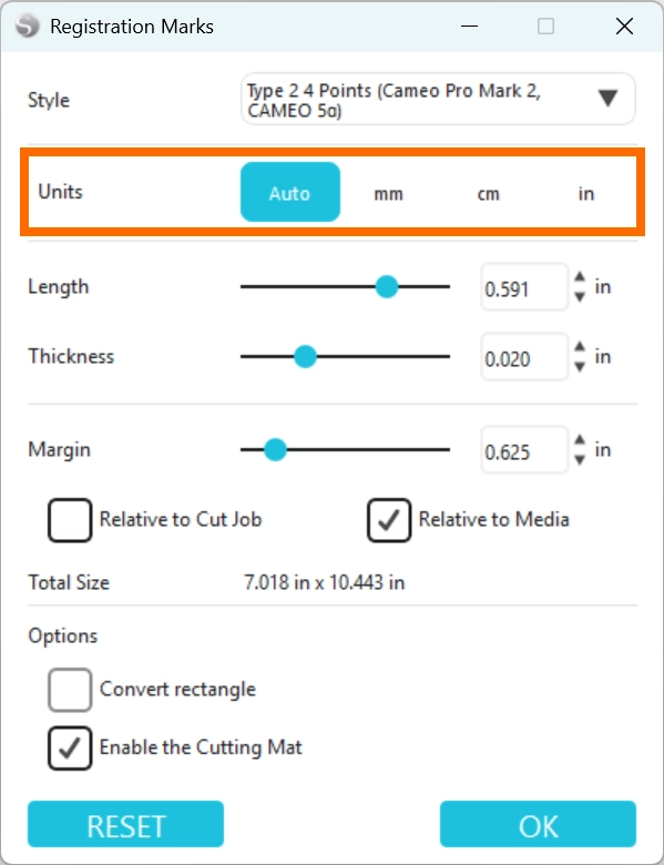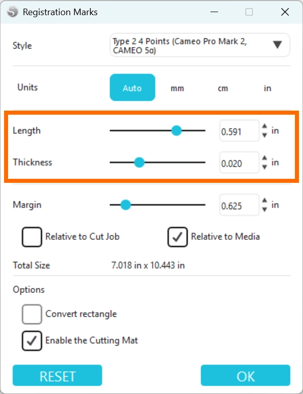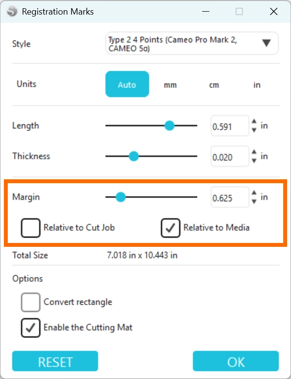 6. [ カットジョブからの距離 ] または[ メディアからの距離 ] のいずれかを選択し、マージンでその距離を設定します。