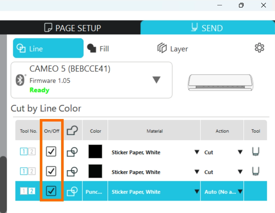 カットやスケッチなど、指定したアクションを行うかどうかを設定します。チェックを外すと、その線/塗りつぶし/レイヤーはカットされません。