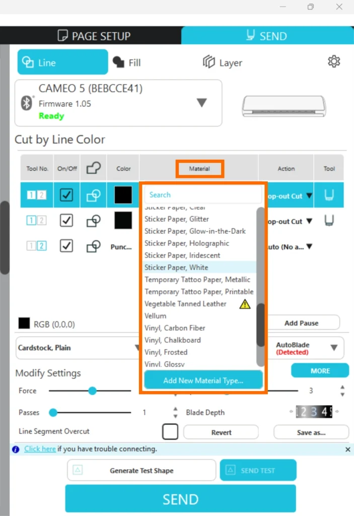 また、[ 新しいマテリアルタイプを追加 ]ボタンをクリックして、その他のメディア用のカット条件に名前を付けて保存することもできます。