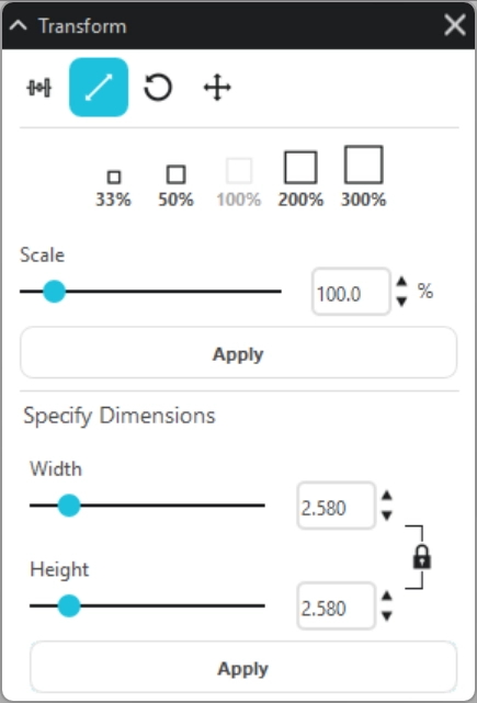 オブジェクトを選択して拡大縮小率をクリックし、[ 適用 ] ボタンをクリックすると、オブジェクトのサイズが変更できます。