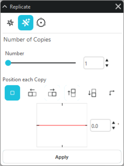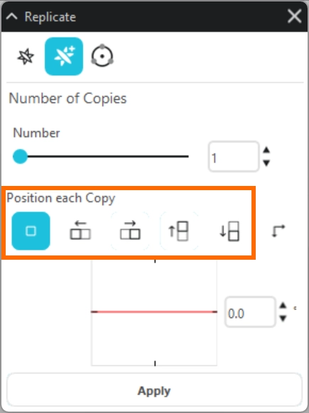 高度な複製パネルでは、オブジェクトの数や方向、角度を指定して複製を行うことができます。