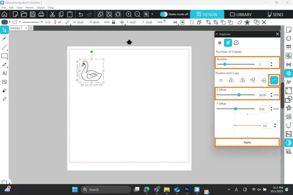 例えば 50mm 角のオブジェクトを 10mm の間隔を空けて横に3つ複製する場合、回数に 3 を設定し、自由指定の X オフセットに 60mm を入力します。