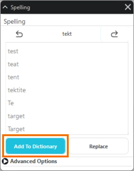 スペルミスと判断されたものの、そのまま使用したい単語を辞書に登録しておくことができます。