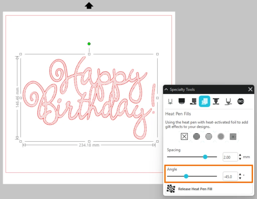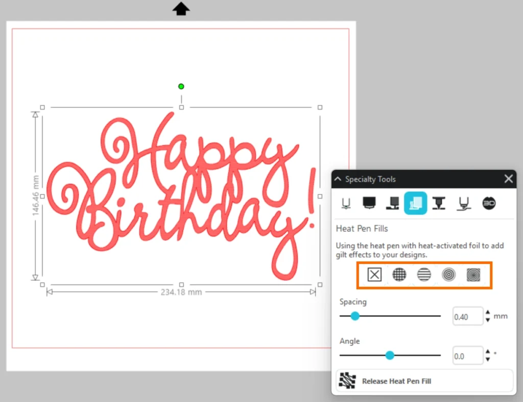 箔押しパターンや間隔、角度を設定したら「ヒートペンフィルをリリース」をクリックして、オブジェクトに効果を適用します。