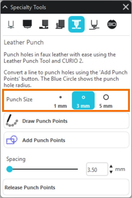 レザーパンチツールの替え刃のサイズを選択します。(1 mm/ 3 mm/ 5 mm)