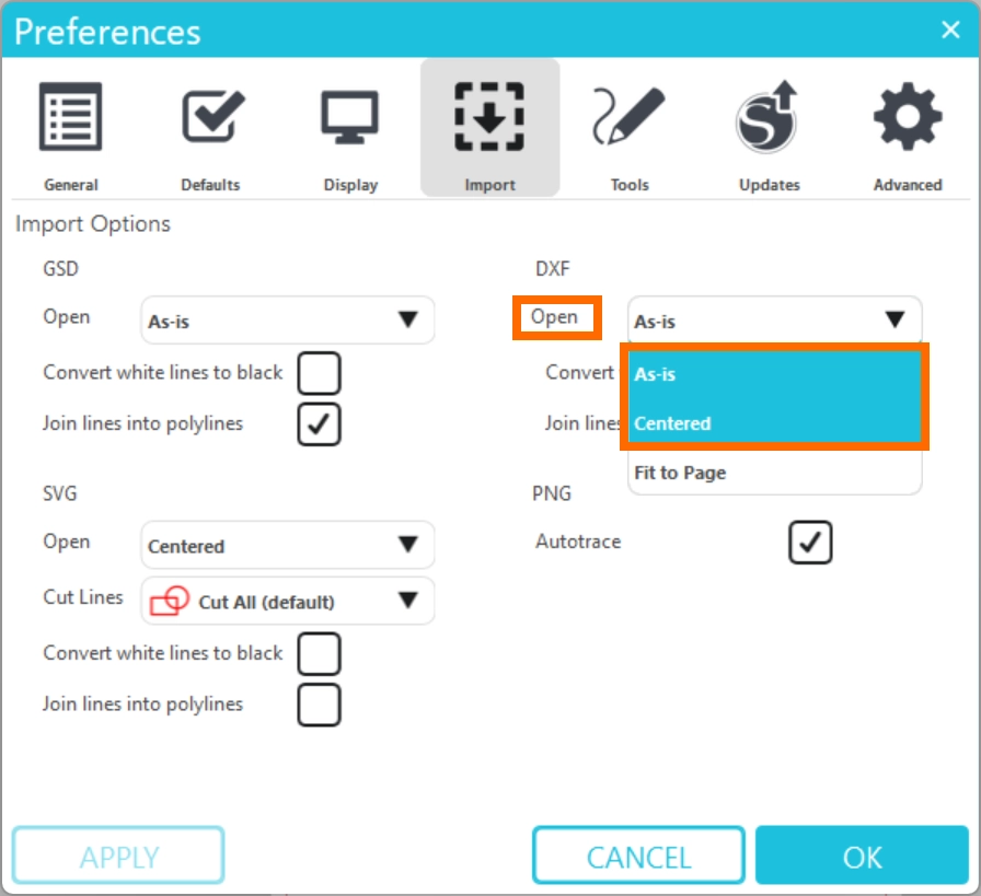 また、環境設定のインポートタブで [DXFの読み込み設定] を [そのまま] または [中央] に設定してください。